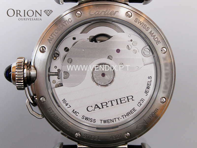 * Cartier Pasha com movimento Cartier calibre 1847 MC mecânico de corda automática com uma frequência de 28,800 A/h alternâncias/horas e com uma reserva de corda aproximada de 40 horas.