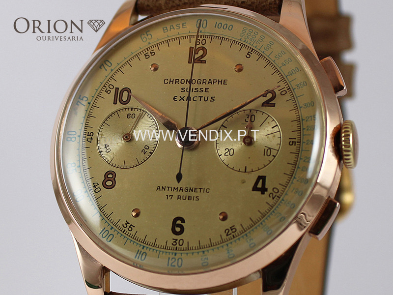 Caixa: Tom de Ouro Rosa, com botões de cronógrafo retangulares clássicos.