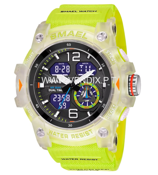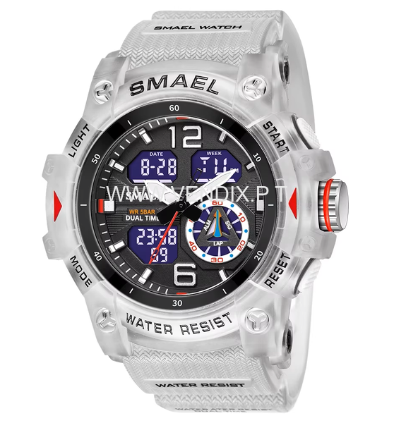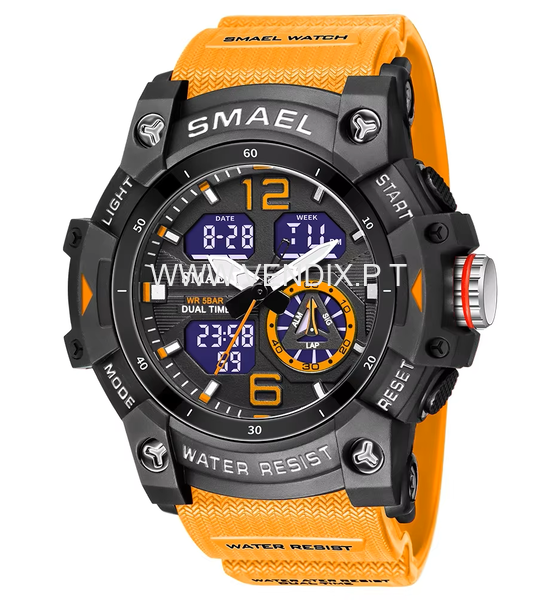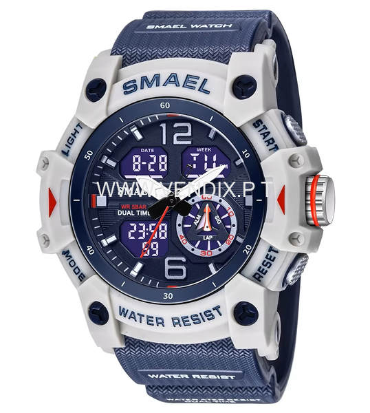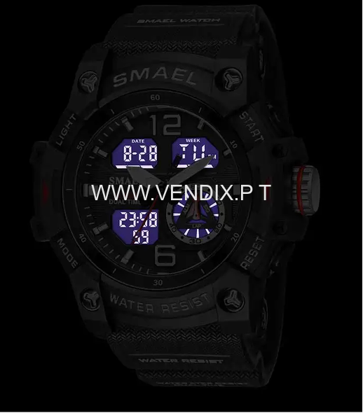 Relógio excelente, á prova de água, desportivo, moderno, indicado para quem pratica desportos náuticos ou outros, é resistente, tem cronómetro, calendário, dia da semana, alarme e é luminoso para se ver bem à noite. Bracelete em silicone, A estrear com etiqueta